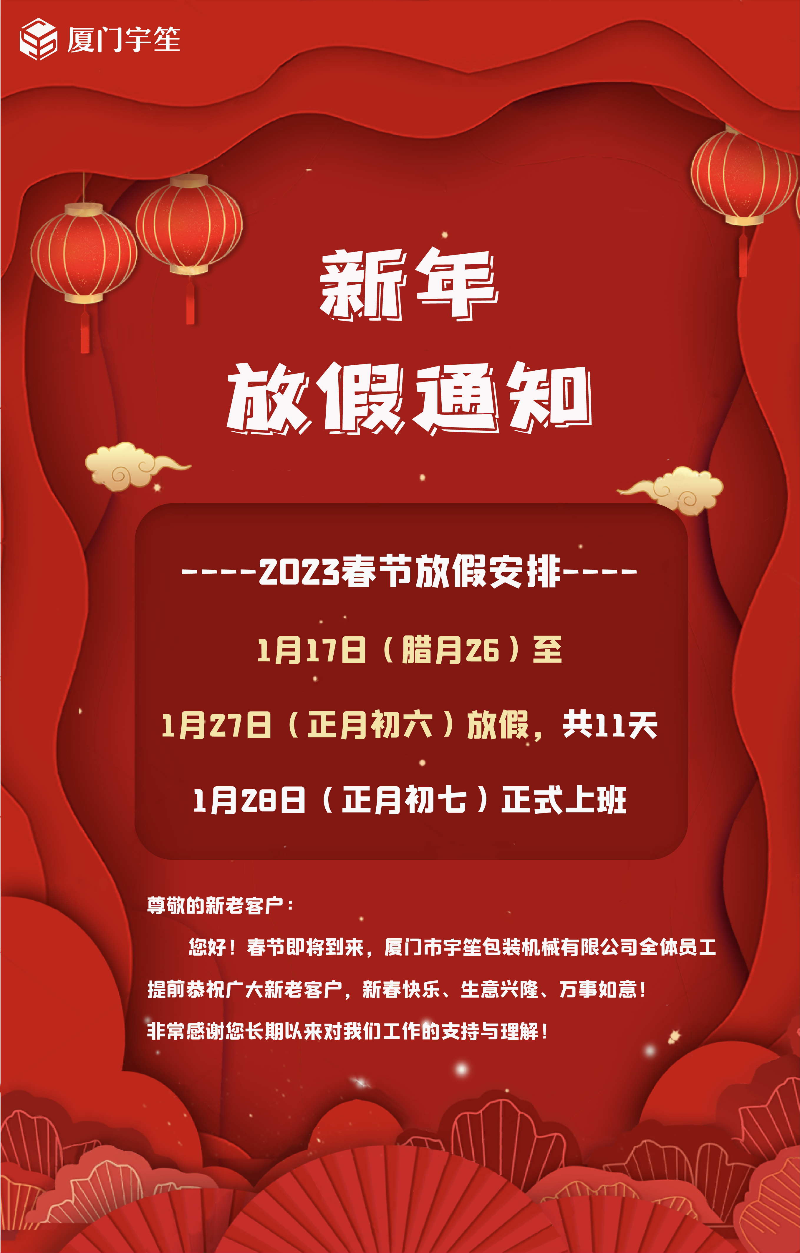 您好!春節(jié)即將到來,廈門市宇笙(宇捷)包裝機械有限公司全體員工提前恭祝廣大新老客戶新春快樂、生意興隆、萬事如意!非常感謝您長期以來對我們工作的支持與理解!